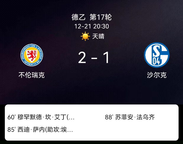 北京时间12月21日,2025赛季德国足球乙级联赛第17轮,布伦瑞克主场对阵沙尔克04。第42分钟沙尔克04领首黄;第60分钟艾丁破门,1-0;第85分钟希迪-萨内建功,2-0;第88分钟法乌齐扳回一城,2-1;双方共1黄、无红牌。最终比分,布伦瑞克2-1沙尔克04。
