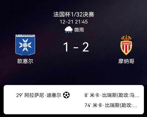 北京时间12月21日,法国杯1/32决赛,欧塞尔主场对阵摩纳哥。第8分钟比雷思头球破门,0-1;第29分钟阿萨内-迪奥塞点射扳平,1-1;第32分钟摩纳哥领首黄;半场后双方累计8黄;第74分钟比雷思再破门,1-2;全场共9黄、无红牌。最终比分,欧塞尔1-2摩纳哥。