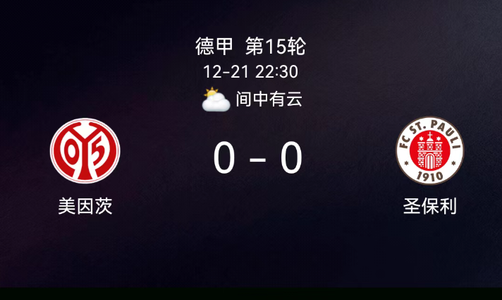 北京时间12月21日,2025赛季德国足球甲级联赛第15轮,美因茨主场对阵圣保利。第22分钟美因茨领首黄;第58分钟圣保利添1黄;双方无进球;全场共2黄、无红牌。最终比分,美因茨0-0圣保利。