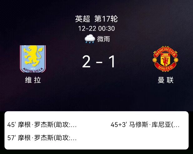 北京时间12月22日0:30,2025赛季英格兰足球超级联赛第17轮,阿斯顿维拉主场对阵曼联。第45分钟罗杰斯世界波破门,1-0;第45+3分钟库尼亚扳平,1-1;第57分钟罗杰斯双响制胜,2-1;第68分钟乌加特领黄;第72分钟达洛特染黄;双方共2黄、无红牌。最终比分,阿斯顿维拉2-1曼联。