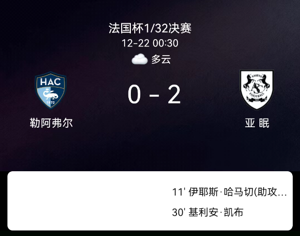 北京时间12月22日,法国杯1/32决赛,勒阿弗尔主场对阵亚眠。第11分钟哈马什破门,0-1;第30分钟凯布建功,0-2;双方无红黄牌。最终比分,勒阿弗尔0-2亚眠。