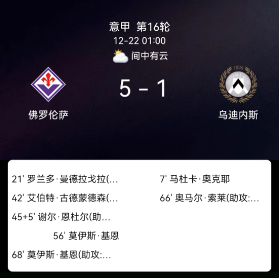 北京时间12月22日,2025赛季意大利足球甲级联赛第16轮,佛罗伦萨主场对阵乌迪内斯。第7分钟奥科耶直红被罚,乌迪内斯十人作战;第21分钟曼德拉戈拉破门,1-0;第42分钟古德蒙德松世界波,2-0;第45+5分钟恩杜尔头球建功,3-0;第56分钟小基恩补射破门,4-0;第66分钟博马沃科扳回一城,4-1;第68分钟小基恩双响,5-1;全场共1红2黄。最终比分,佛罗伦萨5-1乌迪内斯。