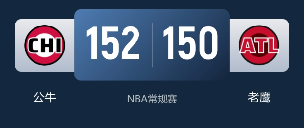 NBA常规赛战报:布泽利斯11中10轰28分公牛9人上双152-150力擒老鹰特雷-杨35+9失绝平球
