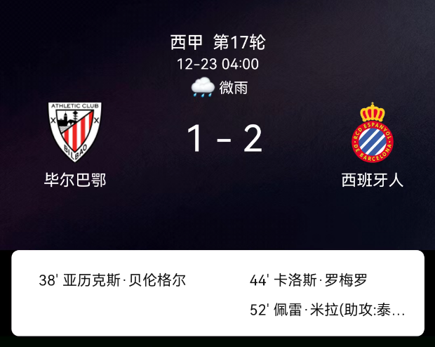 北京时间12月23日,2025赛季西班牙足球甲级联赛第17轮,毕尔巴鄂竞技主场对阵西班牙人。第28分钟德加拉雷塔领黄;第38分钟贝伦格尔破门,1-0;第44分钟罗梅罗扳平,1-1;第53分钟米利亚反超,2-1;全场共1黄、无红牌。最终比分,毕尔巴鄂竞技1-2西班牙人。