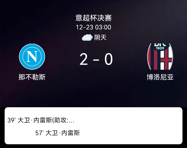 北京时间12月23日,意大利超级杯决赛,那不勒斯对阵博洛尼亚。第39分钟内雷斯世界波破门,1-0;第45分钟黑格姆领黄;第59分钟内雷斯抢断搓射双响,2-0;全场共1黄、无红牌。最终比分,那不勒斯2-0博洛尼亚。