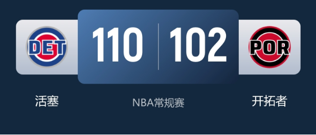 NBA常规赛战报:杜伦26+10统治内线活塞110-102险胜开拓者杨瀚森DNP康宁汉姆6犯仍率队过关