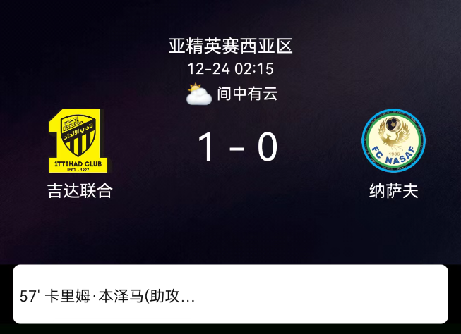 北京时间12月24日02:15,2025-2026赛季亚足联冠军精英联赛第6轮,吉达联合主场对阵纳萨夫。第57分钟本泽马破门,1-0;双方无红黄牌。最终比分,吉达联合1-0纳萨夫。