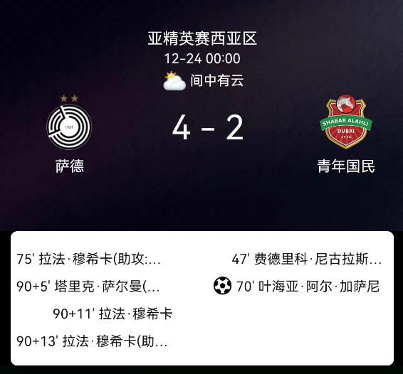 北京时间12月24日00:00,2025-2026赛季亚足联冠军精英联赛第6轮,萨德主场对阵迪拜青年国民。第17分钟迪拜青年国民球员领黄;第47分钟卡塔维亚破门,0-1;第67分钟迪拜青年国民球员领黄;第68分钟米格尔(萨德)领黄;第70分钟叶海亚-加萨尼点球破门,0-2;第75分钟拉法-穆希卡点射破门,1-2,迪拜青年国民球员领黄;第76分钟迪拜青年国民球员领黄;第90+12分钟萨德球员领黄;第90+5分钟塔里克-萨勒曼破门,2-2;第90+11分钟拉法-穆希卡破门,3-2;第90+13分钟拉法-穆希卡完成帽子戏法,4-2;全场共6黄、无红牌。最终比分,萨德4-2迪拜青年国民。
