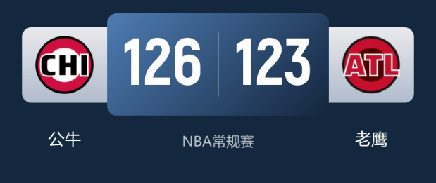 末节决战,场上风云突变。老鹰进攻端手感急速冷却,陷入得分荒。公牛抓住机会发起疯狂反扑,打出一波9-0的凌厉攻势,将分差迅速蚕食至仅剩1分。随后克雷伊奇对特雷-琼斯的防守被判干扰球,公牛成功反超比分;吉迪紧接着单打命中,帮助球队将领先优势扩大到3分。危急时刻,杨空切上篮得分止血,怀特两罚一中后,留给老鹰最后一攻机会,沃克突破上进顽强追平比分。生死时刻,老鹰的里萨谢在无球状态下对怀特犯规,送给公牛罚球机会,武切维奇终场前1.5秒两罚全中锁定胜局。最终,公牛队以126-123完成惊天逆转,豪取4连胜。