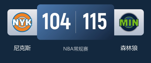 末节决战,兰德尔突然爆发,前三节表现平平的他状态飙升,多次面对唐斯强势强攻得分,单节独揽17分,帮助森林狼将分差重新拉大到两位数。尼克斯虽仍未放弃抵抗,但核心缺阵导致进攻端缺乏稳定终结点,难以组织起有效反扑。最终,森林狼队以115-104稳稳拿下比赛,豪取3连胜。
