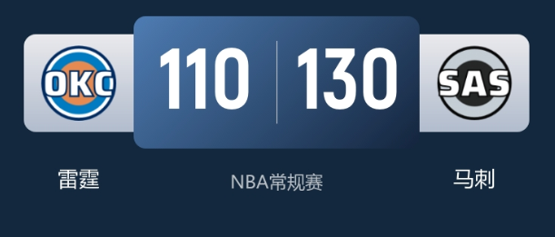 NBA常规赛战报:三核20+主导马刺130-110双杀雷霆送其第4败文班终结101场盖帽纪录亚历山大33+8空砍