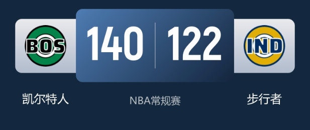 末节决战,凯尔特人完全掌控比赛节奏,再没给对手机会。尽管步行者的沃克等人仍试图通过三分追分,但绿军总能及时回应稳住局势。随着分差持续保持在安全范围,比赛早早进入垃圾时间,双方陆续换上替补阵容练兵。最终,凯尔特人队以140-122稳稳拿下比赛,轻松收获4连胜。