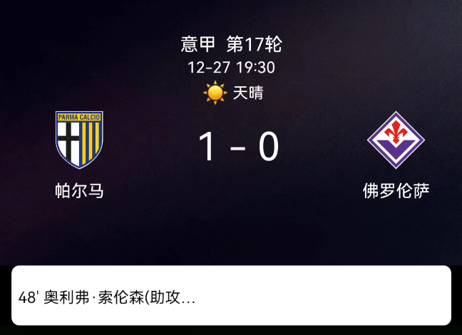 北京时间12月27日19:30,2025-2026赛季意大利足球甲级联赛第17轮,帕尔马主场对阵佛罗伦萨。第20分钟奇尔卡蒂领黄;第22分钟曼德拉戈拉领黄;第48分钟奥利弗-瑟伦森破门,1-0;全场2黄、无红牌。最终比分,帕尔马1-0佛罗伦萨。