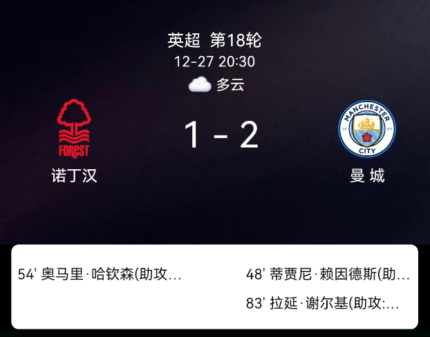 北京时间12月27日20:30,2025-2026赛季英格兰足球超级联赛第18轮,诺丁汉森林主场对阵曼城。第36分钟鲁本-迪亚斯领黄;第48分钟赖因德斯破门,0-1;第54分钟奥马里-哈钦森扳平,1-1;第83分钟谢尔基破门,1-2;全场1黄、无红牌。最终比分,诺丁汉森林1-2曼城。
