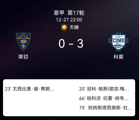 北京时间12月27日22:00,2025-2026赛季意大利足球甲级联赛第17轮,莱切主场对阵科莫。第20分钟尼科-帕斯破门,0-1;第23分钟迪弗朗西斯科红牌罚下;第66分钟哈科沃-拉蒙建功,0-2;第75分钟杜维卡斯锁定胜局,0-3;全场1红、无黄牌。最终比分,莱切0-3科莫。