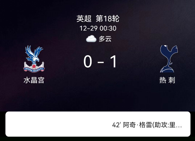 北京时间12月29日1:30,2025-2026赛季英格兰足球超级联赛第18轮,水晶宫主场对阵托特纳姆热刺。第5分钟丹索领黄;第42分钟格雷破门,0-1;全场1黄、无红牌。最终比分,水晶宫0-1托特纳姆热刺。