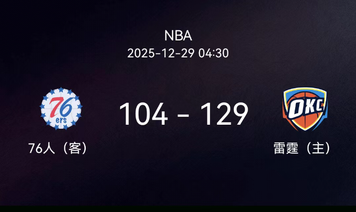 末节回来,雷霆稳扎稳打,继续扩大领先优势,分差很快突破20分。76人虽尝试调整,但内线实力差距明显,且失误过多难以组织有效追分攻势。比赛早早进入垃圾时间,双方纷纷换上替补阵容。最终,雷霆队以129-104轻松拿下比赛,主场成功过关。