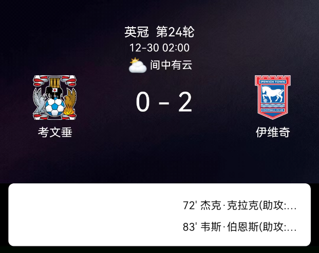 北京时间12月30日3:45,2025-2026赛季英格兰足球冠军联赛第24轮,考文垂主场对阵伊普斯维奇。第72分钟杰克-克拉克破门,0-1;第83分钟韦斯-伯恩斯破门,0-2;双方无红黄牌。最终比分,考文垂0-2伊普斯维奇。