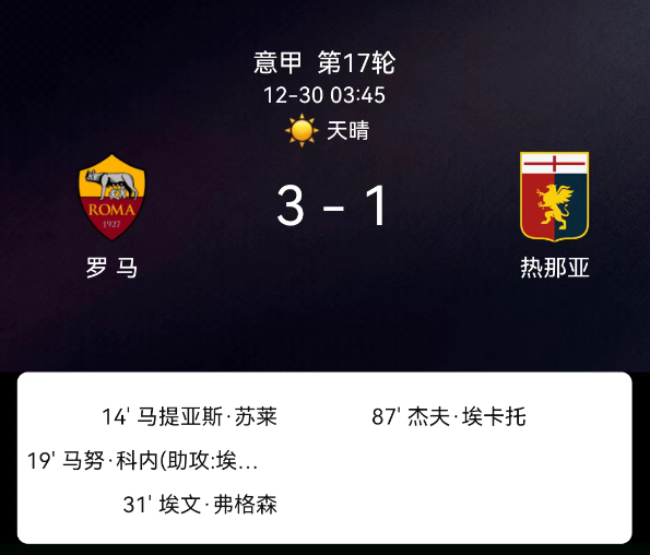 北京时间12月30日3:45,2025-2026赛季意大利足球甲级联赛第17轮,罗马主场对阵热那亚。第14分钟苏莱破门,1-0;第19分钟科内破门,2-0;第31分钟弗格森破门,3-0;第50分钟热那亚1张黄牌;第87分钟埃哈托尔破门,3-1;全场1黄、无红牌。最终比分,罗马3-1热那亚。