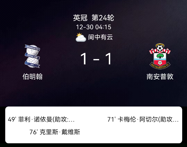 北京时间12月30日4:15,2025-2026赛季英格兰足球冠军联赛第24轮,伯明翰主场对阵南安普顿。第49分钟菲尔-诺伊曼破门,1-0;第71分钟阿彻扳平,1-1;第76分钟克里斯-戴维斯两黄变一红被罚下;全场伯明翰2黄1红,南安普顿无牌。最终比分,伯明翰1-1南安普顿。