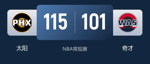 12月30日消息,NBA常规赛上演东西部对决,菲尼克斯太阳队客场挑战华盛顿奇才队。赛前太阳豪取3连胜势头正盛,以18-13稳居西部第7;奇才则以7-23深陷东部倒数第2,虽此前收获两连胜但整体实力有限。最终太阳凭借多点开花的团队表现与关键时刻的稳定发挥,轻松击败奇才豪取4连胜;奇才则虽有特雷-约翰逊的高效输出,却因防守端漏洞百出,无奈吞下败果,连胜势头被终结。