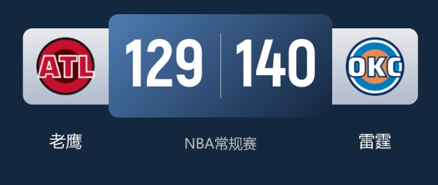 末节决战,老鹰背水一战发起反扑,持续缩小分差,一度将差距迫近到个位数,保留翻盘希望。但雷霆稳住阵脚,亚历山大与霍姆格伦接连命中关键球,牢牢掌控比赛节奏。尽管雷霆防守端依旧无法完全限制老鹰,但凭借此前建立的优势,最终还是将胜果保持到最后。全场战罢,雷霆主场140-129击败老鹰,拿下比赛。