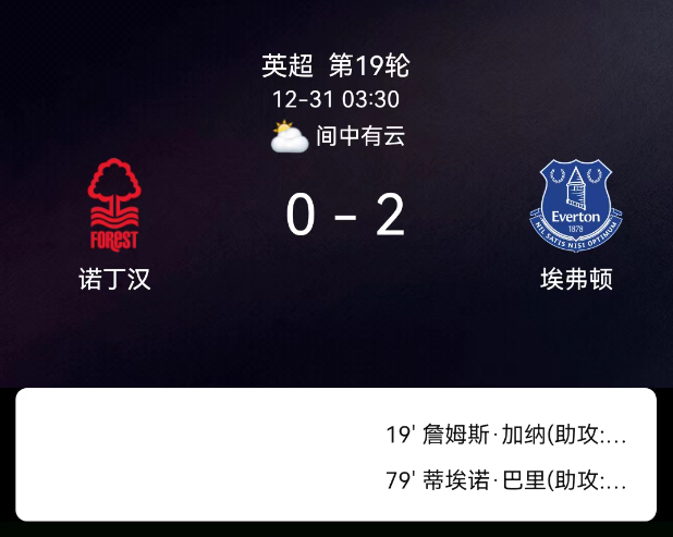 北京时间12月31日3:30,2025-2026赛季英格兰足球超级联赛第19轮,诺丁汉森林主场对阵埃弗顿。第19分钟加纳破门,0-1;第61分钟诺丁汉森林1张黄牌;第79分钟巴里破门,0-2;全场1黄、无红牌。最终比分,诺丁汉森林0-2埃弗顿。