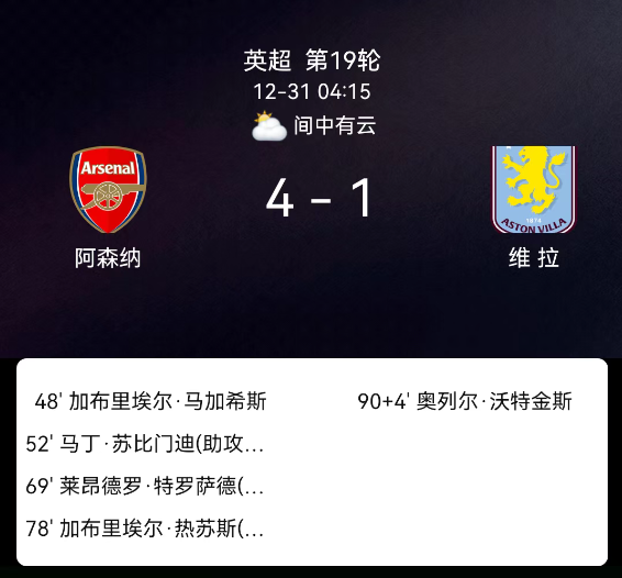 北京时间12月31日4:15,2025-2026赛季英格兰足球超级联赛第19轮,阿森纳主场对阵阿斯顿维拉。第48分钟加布里埃尔破门,1-0;第52分钟苏比门迪破门,2-0;第69分钟特罗萨德破门,3-0;第78分钟热苏斯破门,4-0;第90+4分钟沃特金斯破门,4-1;阿森纳2张黄牌,阿斯顿维拉3张黄牌,无红牌。最终比分,阿森纳4-1阿斯顿维拉。