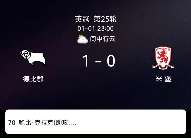 北京时间1月1日23:00,2025-2026赛季英格兰足球冠军联赛第25轮,德比郡主场对阵米德尔斯堡。第70分钟博比-克拉克破门,1-0;双方无红黄牌。最终比分,德比郡1-0米德尔斯堡。