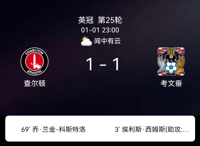 北京时间1月1日23:00,2025-2026赛季英格兰足球冠军联赛第25轮,查尔顿主场对阵考文垂。第3分钟西姆斯破门,0-1;第15分钟考文垂1张黄牌;第69分钟兰金-科斯特洛破门,1-1;查尔顿3张黄牌、考文垂2张黄牌,无红牌。最终比分,查尔顿1-1考文垂。