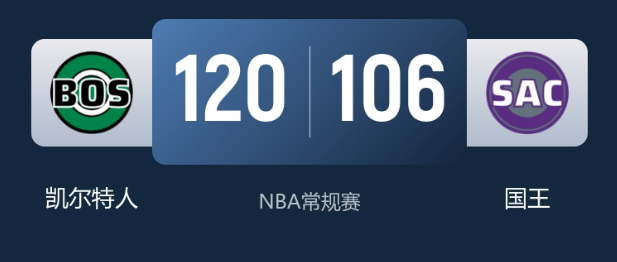 末节决战,布朗和怀特联手爆发,前者打成2+1,后者命中关键三分,带领绿军打出15-6的攻势,一举建立两位数领先。国王多次尝试三分出手均打铁,追分势头受阻。此后布朗逼抢德罗赞,自身累计6犯离场(离场前已砍29+10)。绿军替补稳扎稳打,最终120-106锁定胜局。