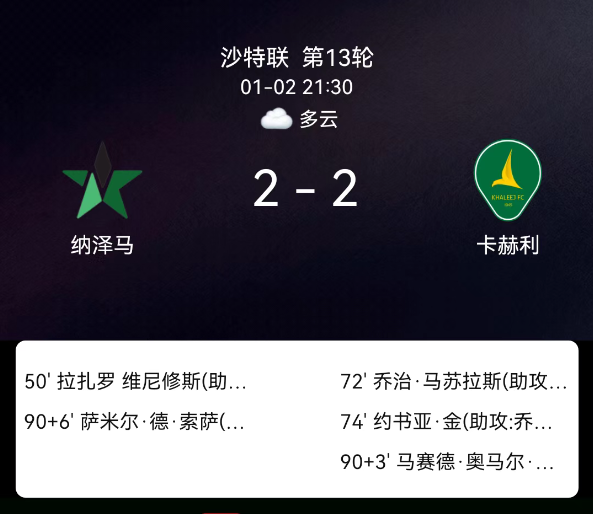 北京时间1月2日21:00,2025-2026赛季沙特阿拉伯联赛第13轮,纳杰马主场对阵卡赫利。第50分钟拉萨罗破门,1-0;第72分钟马苏拉斯破门,1-1;第74分钟约书亚-金破门,1-2;下半场补时第3分钟马吉德-卡纳巴染红;下半场补时第6分钟萨米尔-卡埃塔诺破门,2-2;纳杰马无牌、赛哈特海湾1红,无黄牌。最终比分,纳杰马2-2卡赫利。