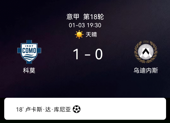 北京时间1月3日19:30,2025-2026赛季意大利足球甲级联赛第18轮,科莫主场对阵乌迪内斯。第18分钟达库尼亚点球破门,1-0;第55分钟扎尼奥洛破门越位无效;双方无红黄牌。最终比分,科莫1-0乌迪内斯。