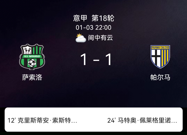 北京时间1月3日22:00,2025-2026赛季意大利足球甲级联赛第18轮,萨索洛主场对阵帕尔马。第12分钟索尔茨维特破门,1-0;第24分钟马特奥-佩莱格里诺破门,1-1;双方无红黄牌。最终比分,萨索洛1-1帕尔马。