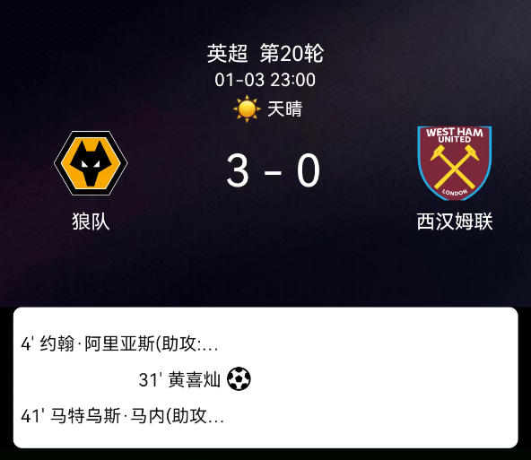 北京时间1月3日22:00,2025-2026赛季英格兰足球超级联赛第20轮,狼队主场对阵西汉姆联。第4分钟阿里亚斯破门,1-0;第31分钟黄喜灿点球破门,2-0;第41分钟马特乌斯-马内破门,3-0;双方无红黄牌。最终比分,狼队3-0西汉姆联。