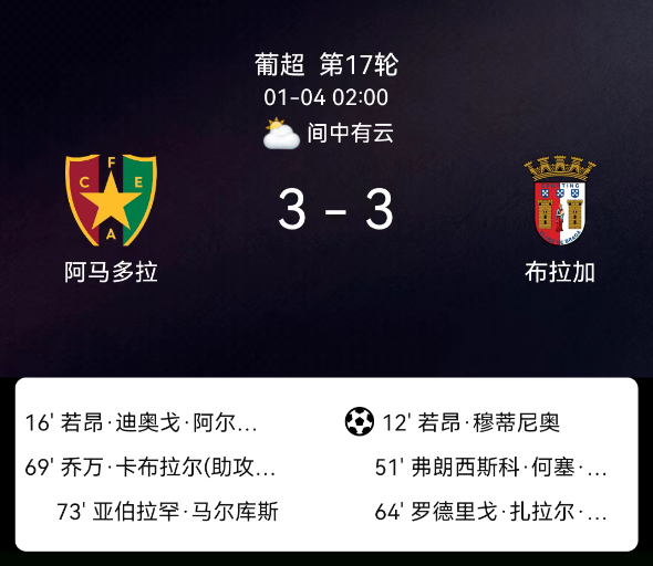 北京时间1月4日04:00,2025-2026赛季葡萄牙足球超级联赛第17轮,阿马多拉之星主场对阵布拉加。第12分钟穆蒂尼奥点球破门,0-1;第16分钟基卡斯破门,1-1;第51分钟弗兰-纳瓦罗破门,1-2;第64分钟萨拉萨尔破门,1-3;第69分钟若瓦内-卡布拉尔破门,2-3;第73分钟亚伯拉罕-马库斯破门,3-3;双方无红黄牌。最终比分,阿马多拉之星3-3布拉加。