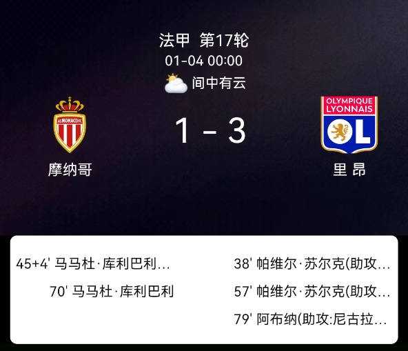 北京时间1月4日00:00,2025-2026赛季法国足球甲级联赛第17轮,摩纳哥主场对阵里昂。第38分钟舒尔茨破门,0-1;第45+2分钟马马杜-库利巴利破门,1-1;第57分钟舒尔茨再破门,1-2;第70分钟马马杜-库利巴利直红罚下;第79分钟阿布纳破门,1-3;里昂2黄、摩纳哥1红1黄。最终比分,摩纳哥1-3里昂。