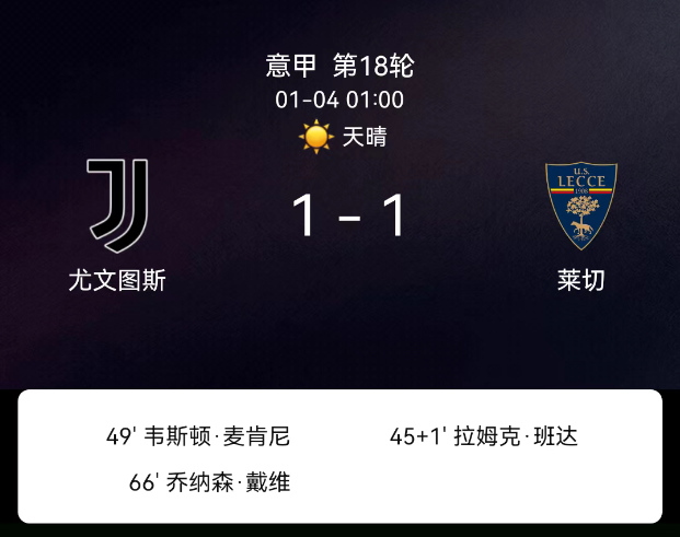 北京时间1月4日03:45,2025-2026赛季意大利足球甲级联赛第18轮,尤文图斯主场对阵莱切。第45+1分钟班达破门,0-1;第49分钟麦肯尼破门,1-1;双方无红黄牌。最终比分,尤文图斯1-1莱切。