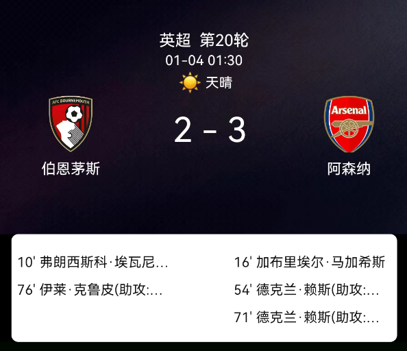 北京时间1月4日01:30,2025-2026赛季英格兰足球超级联赛第20轮,阿森纳客场对阵伯恩茅斯。第10分钟埃万尼尔松破门,0-1;第16分钟加布里埃尔破门,1-1;第54分钟赖斯破门,2-1;第71分钟赖斯再破门,3-1;第76分钟克鲁皮破门,3-2;阿森纳2黄、伯恩茅斯1黄,无红牌。最终比分,阿森纳3-2伯恩茅斯。