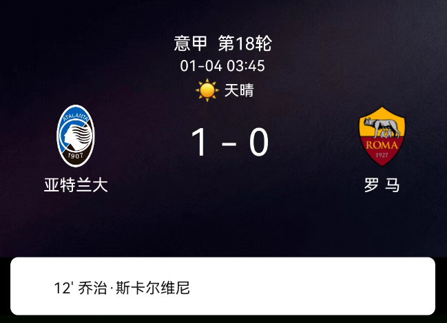 北京时间1月4日03:45,2025-2026赛季意大利足球甲级联赛第18轮,亚特兰大主场对阵罗马。第12分钟斯卡尔维尼破门,1-0;双方无红黄牌。最终比分,亚特兰大1-0罗马。
