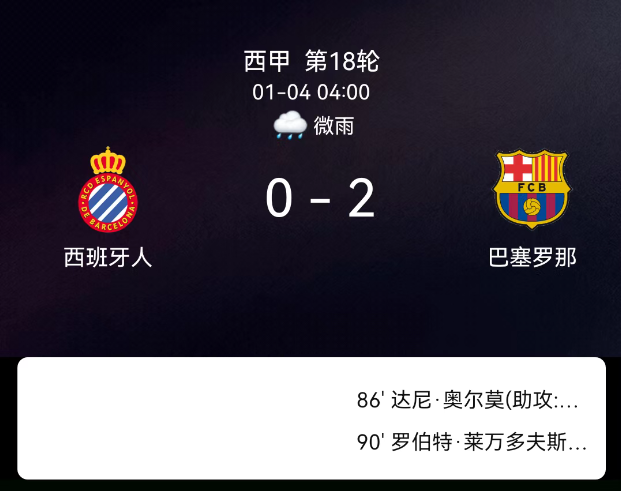 北京时间1月4日04:00,2025-2026赛季西班牙足球甲级联赛第18轮,西班牙人主场对阵巴塞罗那。第86分钟奥尔莫破门,0-1;第89分钟莱万破门,0-2;西班牙人1黄、巴萨无红黄牌。最终比分,西班牙人0-2巴塞罗那。