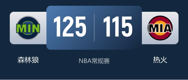 末节决战,森林狼一上来就火力全开,轰出19-5的凌厉攻击波,将分差直接拉开到20分以上。热火绝境中连续命中4记三分顽强续命,但分差过大为时已晚。最终森林狼125-115锁定胜局,成功终结热火4连胜。