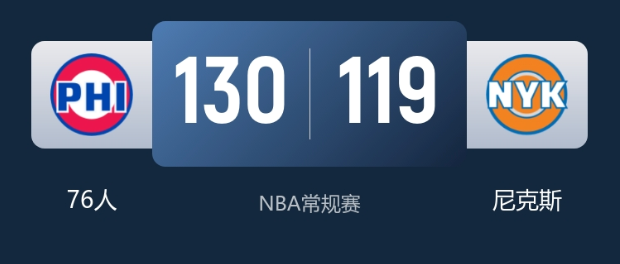 1月4日消息,NBA常规赛东部焦点对决上演,东部第5的费城76人客场挑战东部第2的纽约尼克斯。76人凭借双核爆发和团队火力,最终130-119力克对手,客场收获关键胜利。