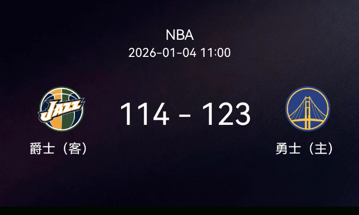 1月4日消息,NBA常规赛对决上演,上场不敌雷霆的金州勇士主场迎战两连败的犹他爵士。追梦节末遭驱逐后,库里第三节爆发带队逆转,最终勇士123-114取胜,送爵士三连败。