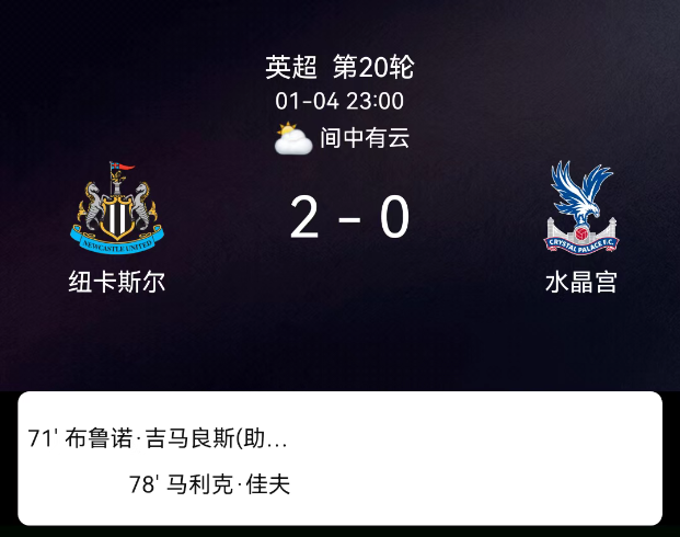 北京时间1月4日22:00,2025-2026赛季英格兰足球超级联赛第20轮,纽卡斯尔联主场对阵水晶宫。第71分钟吉马良斯破门,1-0;第78分钟马利克-佳夫破门,2-0;双方无红黄牌。最终比分,纽卡斯尔联2-0水晶宫。
