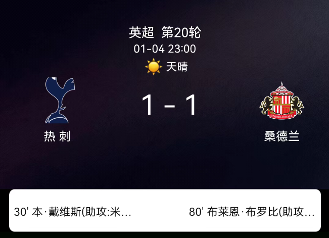 北京时间1月4日22:00,2025-2026赛季英格兰足球超级联赛第20轮,托特纳姆热刺主场对阵桑德兰。第30分钟本-戴维斯破门,1-0;第80分钟布罗贝伊破门,1-1;双方无红黄牌。最终比分,托特纳姆热刺1-1桑德兰。