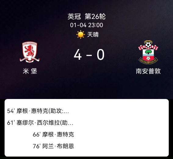 北京时间1月4日23:00,2025-2026赛季英格兰足球冠军联赛第26轮,米德尔斯堡主场对阵南安普顿。第54分钟惠特克破门,1-0;第61分钟西尔韦拉破门,2-0;第66分钟惠特克破门,3-0;第76分钟阿兰-布朗破门,4-0;双方无红黄牌。最终比分,米德尔斯堡4-0南安普顿。