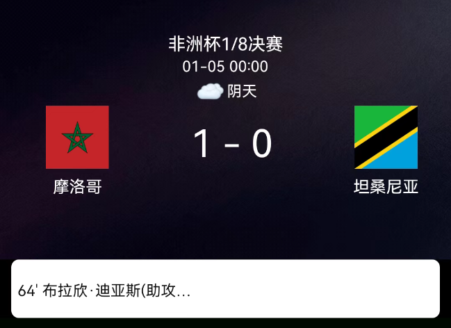 北京时间1月5日01:00,2025非洲国家杯1/8决赛,摩洛哥对阵坦桑尼亚。第64分钟卜拉欣-迪亚斯破门,1-0;第70分钟米罗希两黄变一红罚下;双方各1黄,坦桑尼亚1红。最终比分,摩洛哥1-0坦桑尼亚。