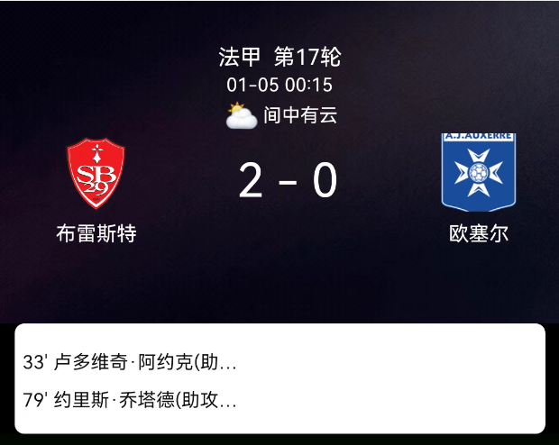 北京时间1月5日00:15,2025-2026赛季法国足球甲级联赛第17轮,布雷斯特主场对阵欧塞尔。第33分钟阿若克破门,1-0;第79分钟肖塔尔破门,2-0;布雷斯特3黄、欧塞尔2黄,无红牌。最终比分,布雷斯特2-0欧塞尔。