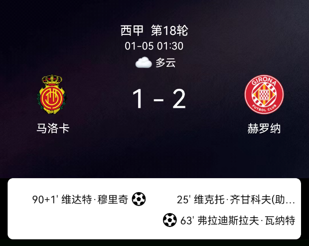 北京时间1月5日03:00,2025-2026赛季西班牙足球甲级联赛第18轮,马略卡主场对阵赫罗纳。第25分钟齐甘科夫破门,0-1;第63分钟瓦纳特点射,0-2;第90+1分钟穆里奇点射,1-2;马略卡2黄、赫罗纳1黄,无红牌。最终比分,马略卡1-2赫罗纳。
